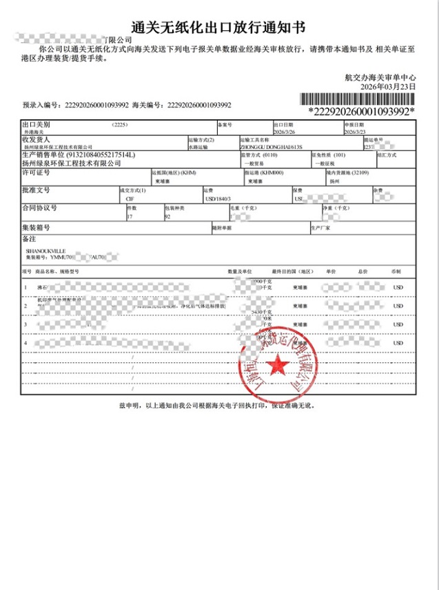 Được biết, thời gian giao hàng này vừa chặt chẽ vừa mang lại hiệu quả cao. Ngày 22, thiết bị đã được đón thành công và ngay lập tức được xếp lên tàu ngay trong ngày hôm đó. Sau đó, tàu sân bay đã ra khơi thành công vào ngày 26, vận chuyển thiết bị sang Campuchia bằng đường thủy. Việc giao hàng này không chỉ thể hiện khả năng thực thi hiệu quả cao của Lvquan Environmental trong quản lý hậu cần xuyên biên giới mà còn thể hiện vị thế công nghệ hàng đầu của họ trong lĩnh vực xử lý khí thải công nghiệp cho ngành in.